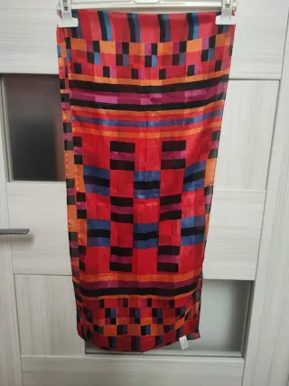 Sciarpa con un vivace motivo geometrico. Lunghezza 155, larghezza 37. - Tessuto leggero e fluido. - Motivo a scacchi e righe. - Dettagli in nero, blu e arancione.