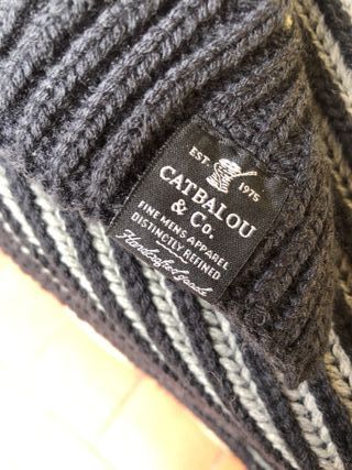 Sciarpa in ciniglia con un design a righe. Perfetta come nuova, indossata solo una volta. Maglione grigio scuro, misure: da spalla a spalla 46 cm, lunghezza 75 cm. Design a righe orizzontali. Tessuto morbido e caldo.