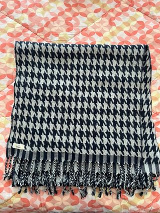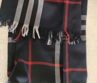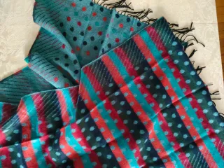 Sciarpa in tessuto morbido con un design classico. Dettaglio di frange alle estremità. È sottile, non spessa. Texture piacevole al tatto (cotone). Nuova senza etichetta. Lunghezza: 180 cm, larghezza: 32 cm.