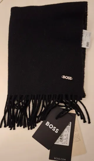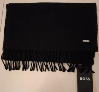 Sciarpa del marchio BOSS in colore nero, completamente nuova con etichette. Mai usata. 100% lana. Design elegante con frange, molto calda. Logo metallico del marchio.