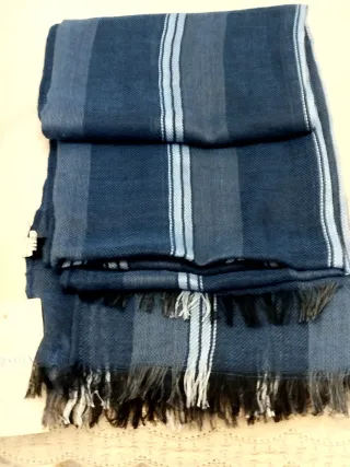Pashmina uomo leggerà e morbida a righe azzurre su fondo grigio chiaro. Perfetta per la mezza stagione, quindi primavera e autunno, e da abbinare con qualsiasi cosa. Sia con abbigliamento sportivo, casual che elegante col cappotto. Molto versatile, come nuova.