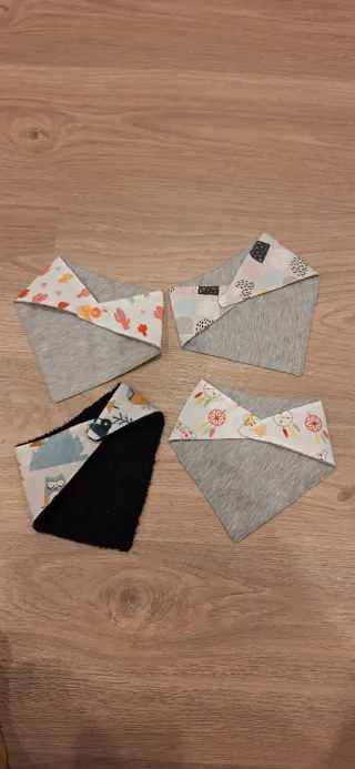 Set di quattro bavaglini bandana per bambini con design vari. Design di cactus in toni pastello. Stampa geometrica con nuvole e punti. Motivi di montagna, foresta e scoiattolo. Disegni di gufi e presepi.