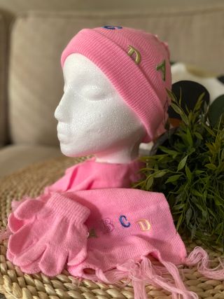 Set invernale per bambini per tenerti al caldo. - Cappello a maglia con pompon e lettere ricamate. - Sciarpa abbinata con frange. - Guanti abbinati. - Disponibile in rosa o rosso.