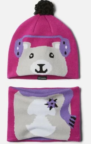 Set di due cappelli e una sciarpa per bambini, ideale per tenerli al caldo. - Cappello in maglia con dettaglio di orsetto. - Cappello con bordo in tessuto e dettagli di fiocchi di neve. - Sciarpa morbida con bordo cucito e dettaglio di orsetto.