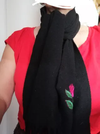 Elegante sciarpa in pashmina con un bellissimo ricamo floreale 214 cm x 70 cm circa. Nuova - Motivo floreale con coralli. - Dettagli ricamati con perline. - Frange decorative alle estremità.