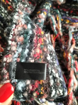 Sciarpa con un design vivace e dettagli colorati. Il tessuto presenta una trama interessante con fili di diverse tonalità. - Fantasia a righe verticali. - Orlo con frange. - Tessuto bouclé.