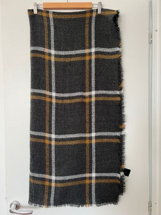 Maxi sciarpa scialle stola tartan Dimensioni 184 x 89 cm Colore grigio scuro, giallo senape e bianco Usata ma ancora in buone condizioni, giusto i pallini che si possono togliere con il levapelucchi