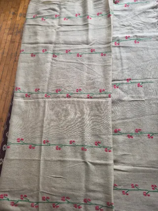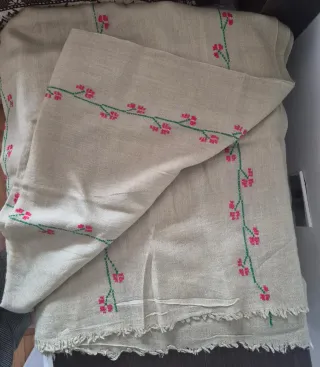 Elegante sciarpa in pura lana, realizzata a mano con un delicato motivo floreale. - Materiale: 100% pura lana - Design: Motivo floreale ricamato con filo verde e rosa - Finitura: Frange decorative sul bordo