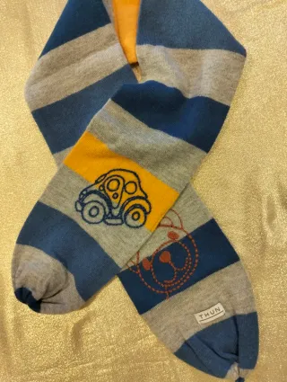 Sciarpa per bambini Thun con ricamati simpatici disegni - Fantasia a righe blu e grigie. - Dettaglio di un'auto e un orsetto ricamati. - Morbido tessuto per il massimo comfort.