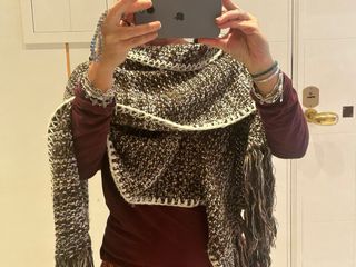 Sciarpone in lana ,possibilità di usarlo in diversi modi come da foto. Stupendo! Caldo e pesante. Etichetta interna non presente in quanto è stato fatto a mano. Caldo, avvolgente e consistente.Di eccellente fattura. Il colore e’ marrone / panna