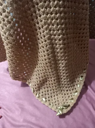 Elegante scialle realizzato all'uncinetto con filato di lana. Presenta un raffinato bordo in raso che aggiunge un tocco di classe. Misure in foto - Lavorazione artigianale all'uncinetto. - Morbido filato di lana. - Dettaglio di bordo in raso.