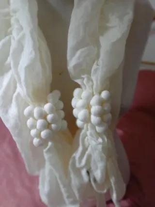 Sciarpa color panna con un design unico. - Decorata con grappoli di sfere che ricordano l'uva. Lunghezza 170cm. Viscosa 100% - Tessuto leggero e arioso. - Dettagli decorativi sulle estremità.