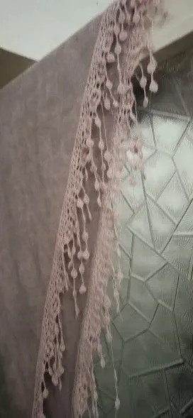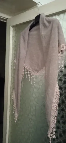 Sciarpa di forma triangolare, perfetta per aggiungere un tocco di eleganza. - Dettagli in pizzo e frange con perline. - Tonalità lilla delicata.