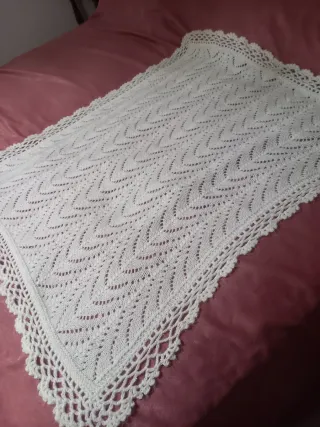 Elegante scialle lavorato a maglia, perfetto per aggiungere un tocco di calore e stile. Bordo crochet. Misure in foto - Realizzato in lana. - Design a tricot con motivo traforato.