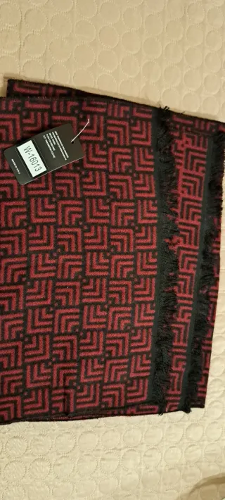 Elegante sciarpa con una fantasia geometrica in rosso e nero. Perfetta per aggiungere un tocco di stile. - Design a fantasia. - Bordi con frange.