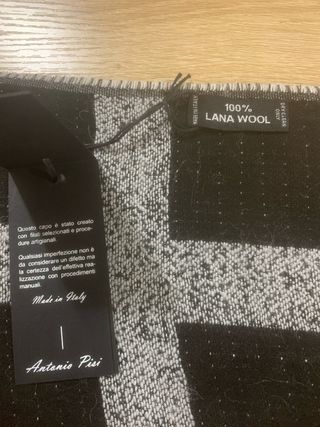 Nuova Sciarpa di manifatture artigianali in Pura lana al 100%, marca Antonio Pisi, Made in Italy, di colore Grigio e nera, a quadrettoni, misura di lunghezza misura 180 Cm frangia esclusa che misura 3 Cm, la larghezza è di 80 Cm.