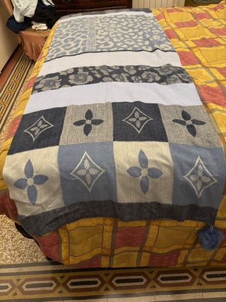 È una sciarpa a fantasia in varie gradazioni di blu, azzurro e grigio. In uno dei lati è a quadri. È in morbida viscosa. È lunga 170 cm e larga 65 cm.