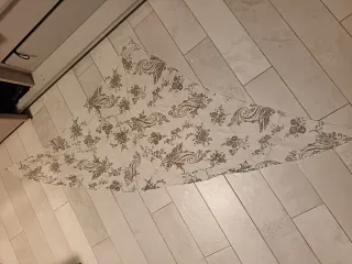 È una sciarpa sottile e semitrasparente. È lunga 170 cm e larga 72 cm.