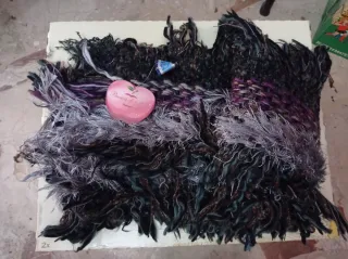 Sciarpa da donna con un design unico e texture morbida. - Effetto peloso e frange. - Dettagli in filato metallico e viola.
