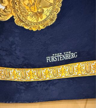 Elegante foulard in seta di Egon Von Furstenberg con elegante stampa barocca nei colori blu navy, bianco e oro Misure 86 x 86 cm. - Tessuto in seta pregiata, ottime condizioni