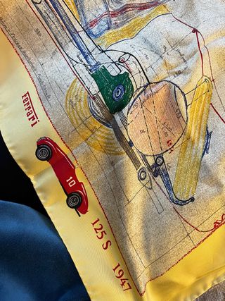 Elegante foulard in pura seta Ferrari, con un design ispirato alla storica 125 S del 1947. - Tessuto: 100% pura seta. - Motivo: Disegno tecnico e auto d'epoca Ferrari. - Colori predominanti: Giallo, rosso, blu e verde. Unico difetto, l’etichettina “pura seta” è staccata da un lato. Nella sua confezione originale come da foto.