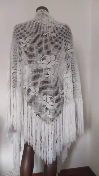 Bellissimo scialle lavorato all'uncinetto con frange. - Motivo floreale centrale. - Bordo con frange. - Lavorazione a maglia.