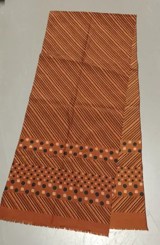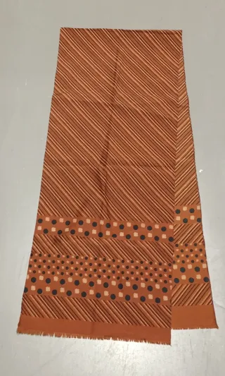 Sciarpa vintage in raso con una fantasia unica. - Motivo a righe diagonali. - Fasce con pois e quadratini. - Bordi sfrangiati.