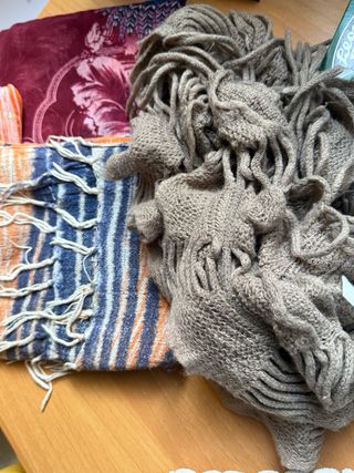 Set di sciarpe da donna con fantasie e texture diverse. - Sciarpa arancione con frange. - Sciarpa bordeaux con stampa floreale. - Sciarpa con motivo a righe blu e arancioni. - Sciarpa lavorata a maglia color tortora. #set #setsciarpe #setsciarpedonna #sciarpe #sciarpedonna #sciarpainvernale #sciarpadonna #colorate #inverno #donna #blocco #bloccosciarpe