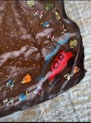 Elegante foulard Braccialini con una base marrone arricchita da pois e una vivace cornice di disegni. - Fantasia con macchinine e personaggi colorati. - Pois dorati su tutta la superficie. - Angoli decorati con scritte e disegni.