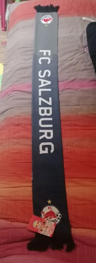 Sciarpa ufficiale dell'FC Salzburg, perfetta per i tifosi. - Design con logo e nome della squadra. - Colori grigio e blu.