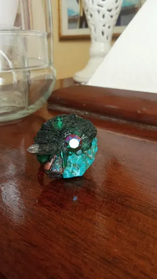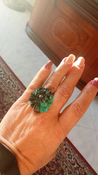 Bellissimo anello fatto a mano con pietre naturali. - Dettagli in pietra verde. - Accenti di pietra turchese. - Elemento decorativo centrale sfaccettato.