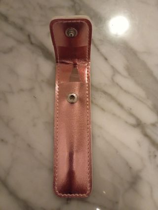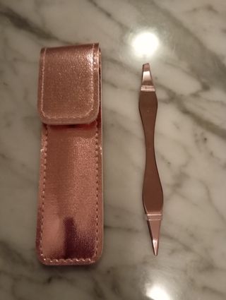 Pinzetta per sopracciglia, con custodia. Doppia: una pinzetta per lato, di dimensioni diverse. Nuova, mai utilizzata, ancora con i blocchi originali.