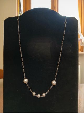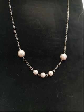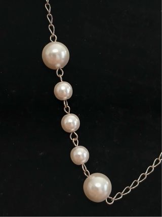 Elegante collana Patrizia Pepe con perle. - Catena sottile color argento. - Diverse perle bianche di varie dimensioni. - Chiusura a moschettone.