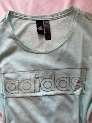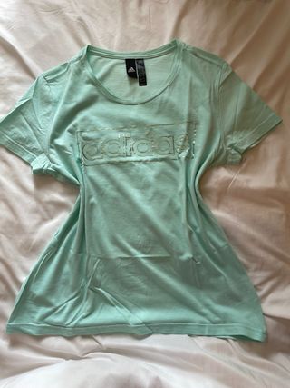 Maglietta Adidas da donna in un bel colore teal. Presenta il logo Adidas in rilievo sul davanti, in cotone. Presenti due piccolissime macchie di fabbrica all'altezza della scapola sinistra. Misure: spalle 40, torace 40, lunghezza 59.