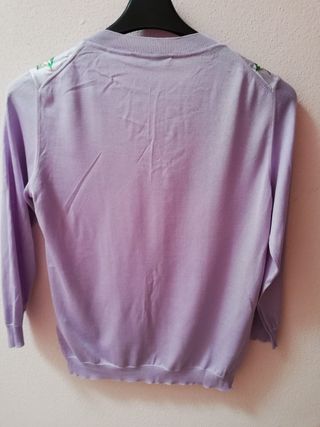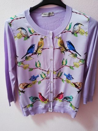 Nuovo mai indossato, TG S, colore lilla , materiale seta, fantasia uccelli.È bellissima, altissima qualità. Maniche 3/4,misure spalle 37, petto 37, lunghezza totale 60cm.
