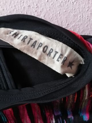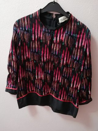Mai indossato, TG M, maglietta donna elegante, davanti seta fantasia multicolore, dietro nero con chiusura lampo .