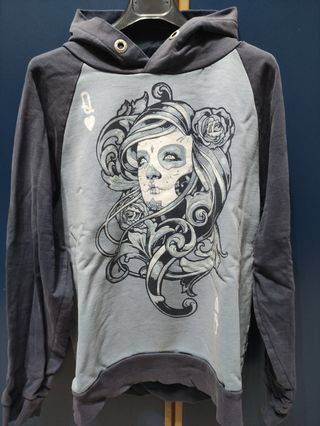Felpa indicata come taglia XL ma è molto più piccola, come una S. È un po' scolorita a causa dei lavaggi e presenta una scucitura sul bordo in basso. Non presenta i lacci del cappuccio.
