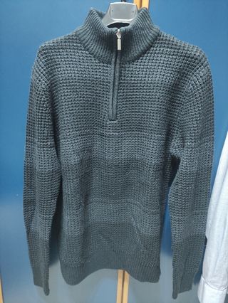 Maglione blu con collo alto e zip. Taglia M. Presenta leggeri segni di usura sul retro.