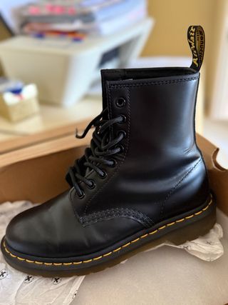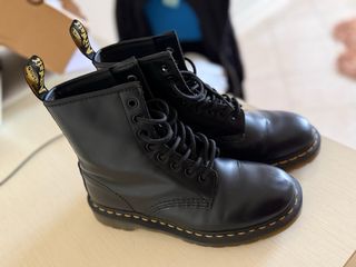 Iconici stivali Dr. Martens in ottime condizioni. - Tomaia in pelle liscia. - Cuciture Goodyear gialle a vista. - Passalacci con occhielli metallici. - Linguetta posteriore con logo AirWair.