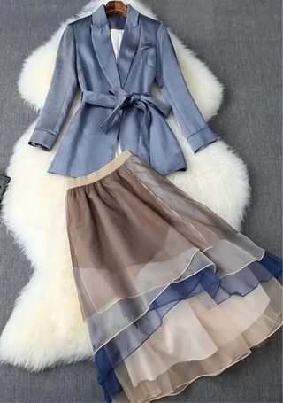 Elegante completo da donna composto da giacca e gonna. - Giacca blu con cintura. - Gonna multistrato con sfumature marroni e blu. 95% poliestere 5% elastane