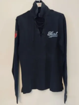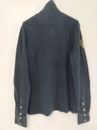 Felpa Fiat vintage da uomo con dettaglio a lacci sul collo. Presenta un logo ricamato sul petto e una patch sulla manica. Colore blu scuro Indossata pochissimo #fiat #felpa - Collo tipo polo con allacciatura. - Logo Fiat ricamato. - Patch sulla manica sinistra.