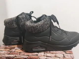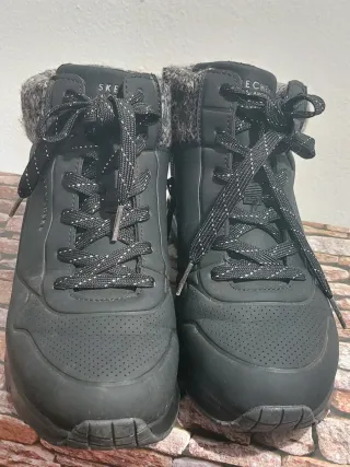Scarponcini da donna Skechers in colore nero. - Design a stivaletto con finiture in maglia. - Chiusura laterale con zip. - Lacci decorativi sul davanti. - Suola spessa con dettagli a vista.