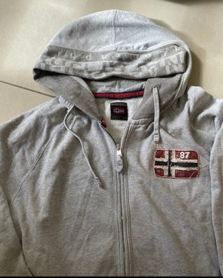 Felpa con cappuccio e zip frontale. - Patch con bandiera e numero 87 sul petto. - Dettagli trapuntati sulle maniche. - Tasche a marsupio.