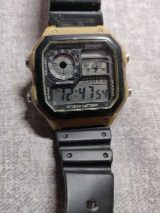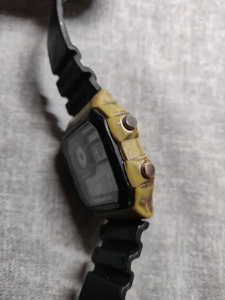 Orologio digitale Casio con cassa color beige e cinturino nero. Resistente all'acqua fino a 100 metri. Funzionante - Quadrante digitale. - Funzione 10 Year Battery.