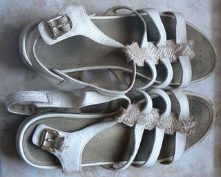 Sandali Marca: Geox Misura non scritta ma calza un 38 Colore: bianco panna/beige Sono stati usati ma sono ancora in buone condizioni. Presentano delle screpolature sulla gomma (vedi foto) ma sono ancora molto buoni, ottima marca. Costo originale: 89 euro