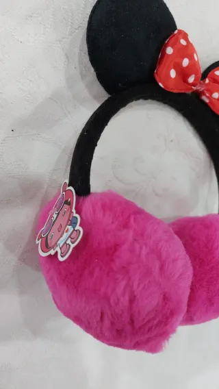 Morbidi paraorecchie ispirati a Minnie Mouse, perfetti per un tocco di stile. - Orecchie nere rotonde. - Fiocco rosso a pois bianchi. - Paraorecchie in peluche rosa.