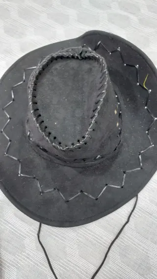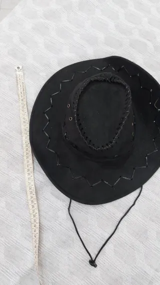 Cappello da cowboy nero con dettagli in similpelle. - Cuciture decorative a zig-zag. - Cordino sottogola.
