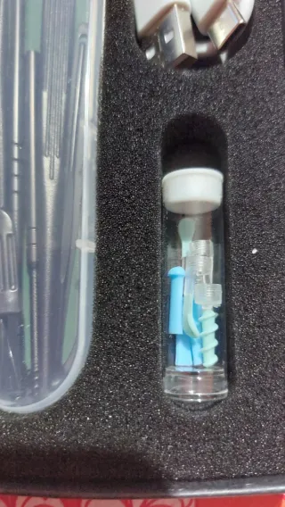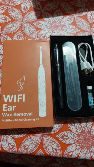Kit per la rimozione del cerume dall'orecchio con connessione WiFi. Include diversi accessori per una pulizia completa. - Dispositivo principale con finitura lucida. - Accessori per la pulizia inclusi. - Cavo di ricarica USB.mai usato