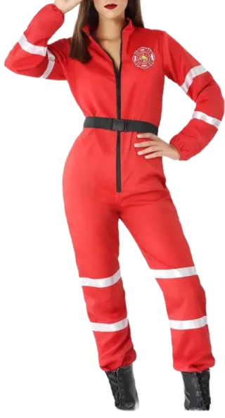 Costume da pompiere per donna, taglia XL. Perfetto per feste a tema o travestimenti. - Tuta intera rossa con dettagli bianchi. - Cappello coordinato incluso. - Cintura nera in vita.