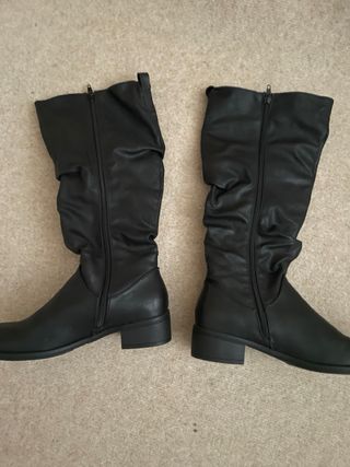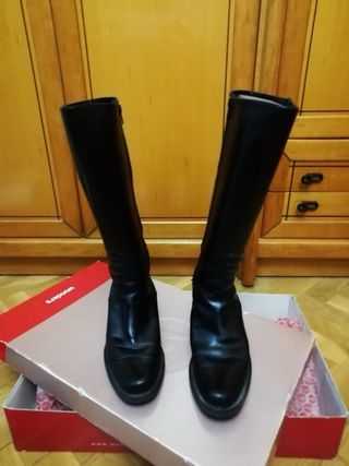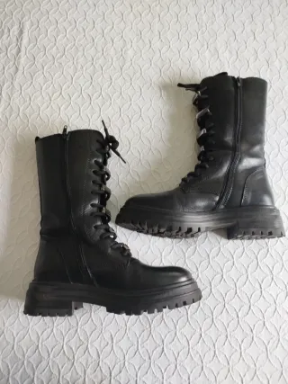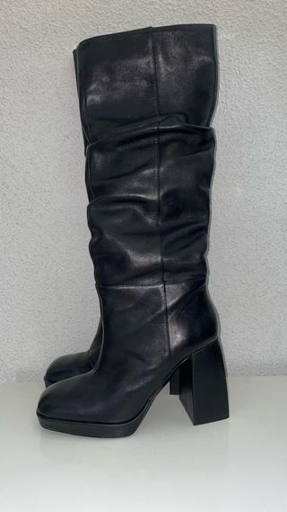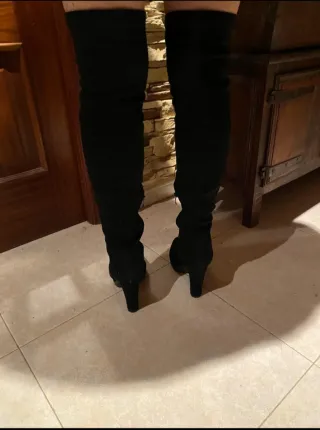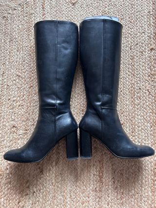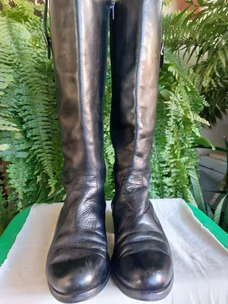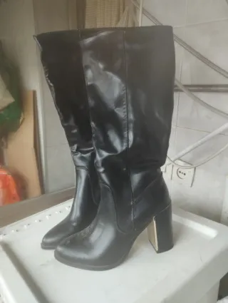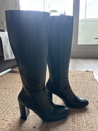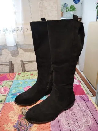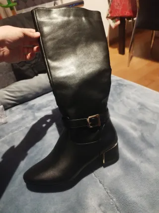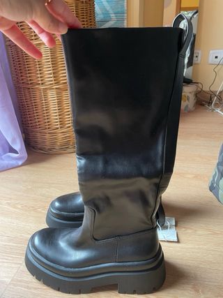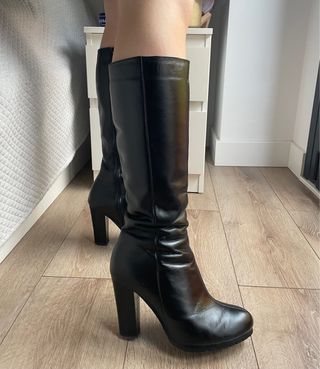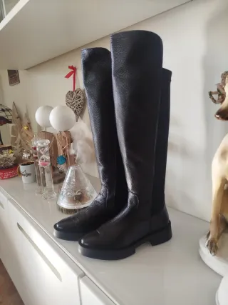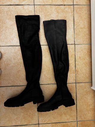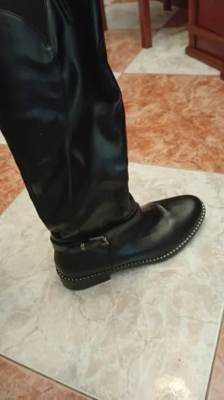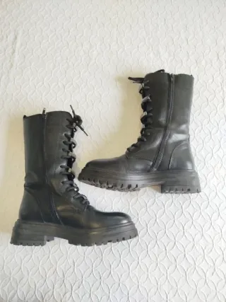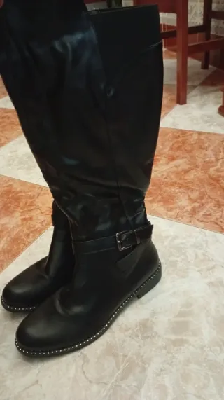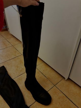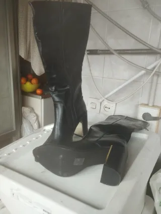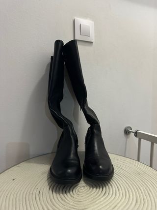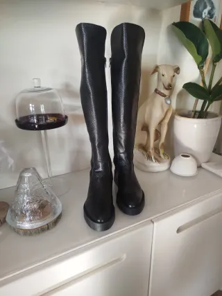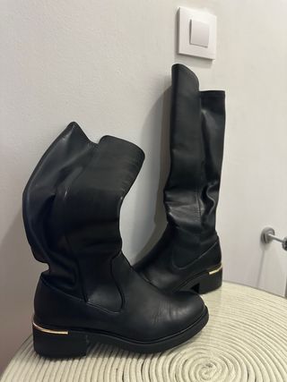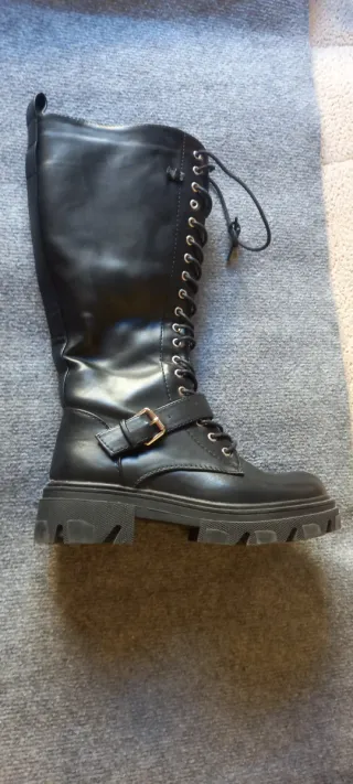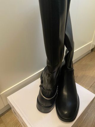 Stivali alti in colore nero. - Cerniera laterale, l'altra laterale simulata. - Suola spessa. - Dettaglio di cinturino nella parte superiore. Usate una volta, super comode, mi piacciono, ma non mi vedo con quel look, sono impeccabili come se le comprassi nuove.